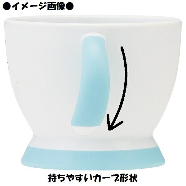 手前に曲がっていて両手で握りやすい持ち手と、すそ広がりで倒れにくい形状がポイントの両手持ちコップです。