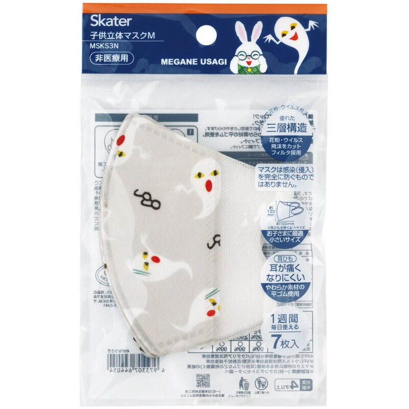 【4個までメール便可】マスク 不織布 立体 7枚入り 子供用 キッズ スケーター skater 不織布マスク 子ども 子供 MSKS3N めがねうさぎ せなけいこ 絵本 男の子 女の子【耳が痛くない 息がしやすい 快適 園児 幼児 かわいい キャラクター】