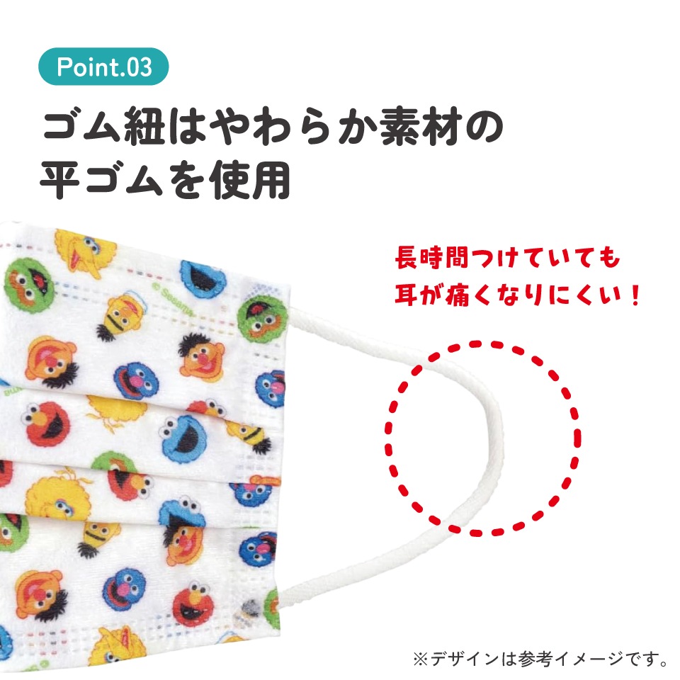 耳が痛くなりにくいやわらか素材の平ゴムを使用。