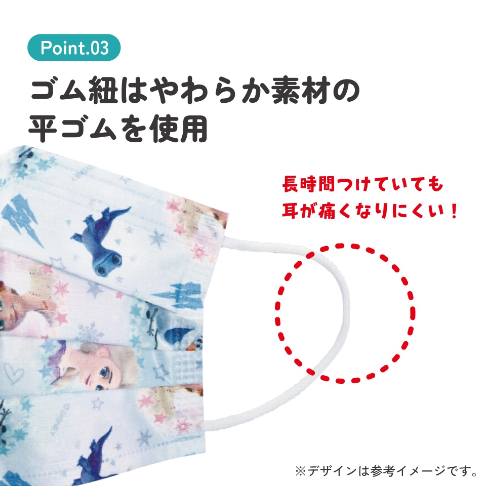 耳が痛くなりにくいやわらか素材の平ゴムを使用。