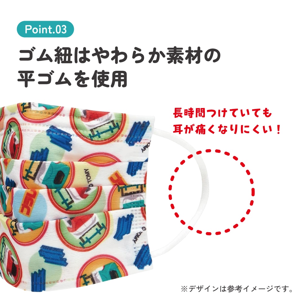 耳が痛くなりにくいやわらか素材の平ゴムを使用。