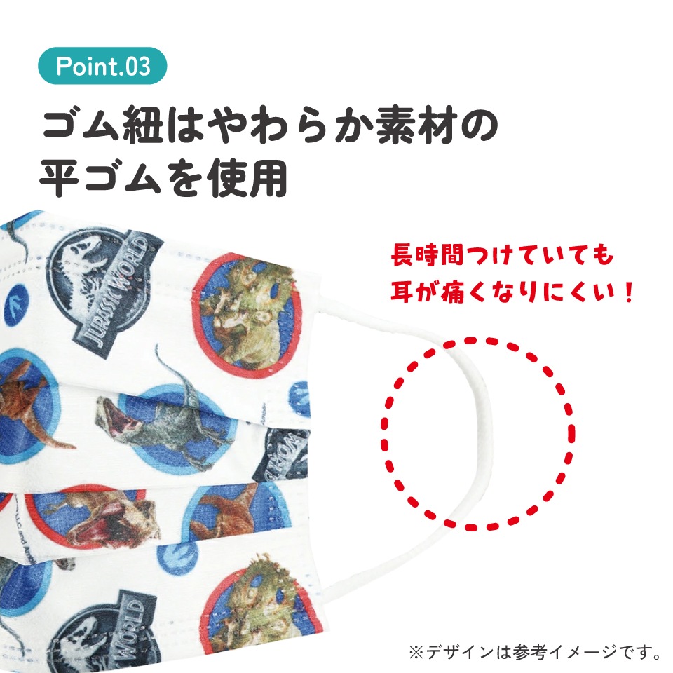 耳が痛くなりにくいやわらか素材の平ゴムを使用。