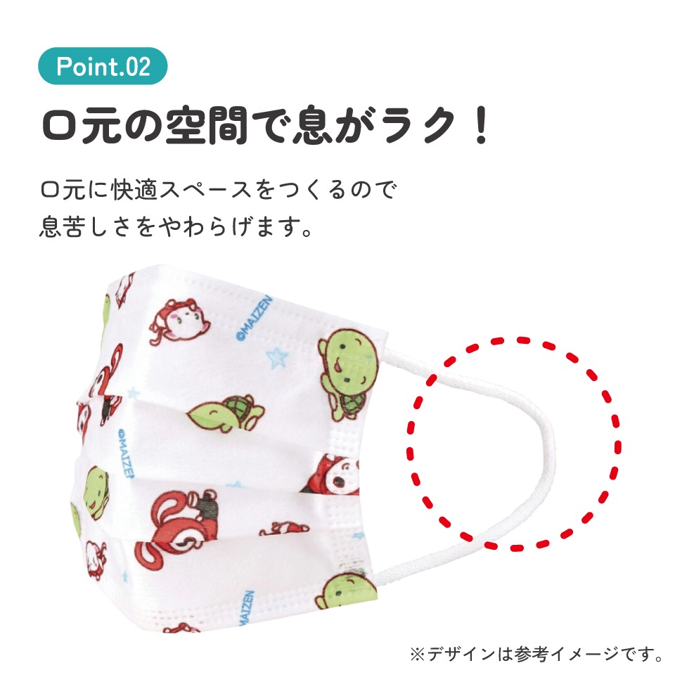 耳が痛くなりにくいやわらか素材の平ゴムを使用。